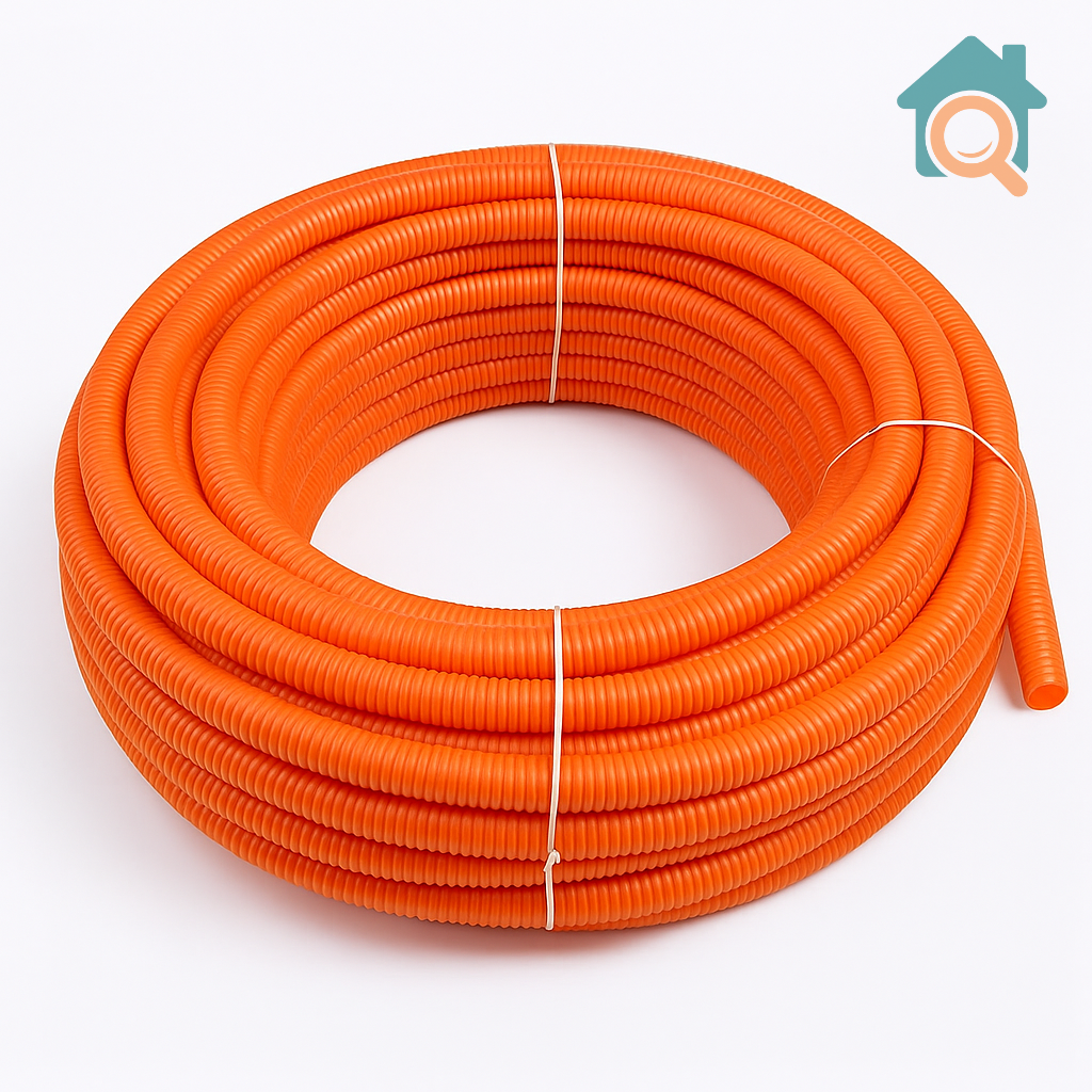 Caño corrugado naranja de 25 mm, flexible y resistente para proteger cables con seguridad y facilidad.